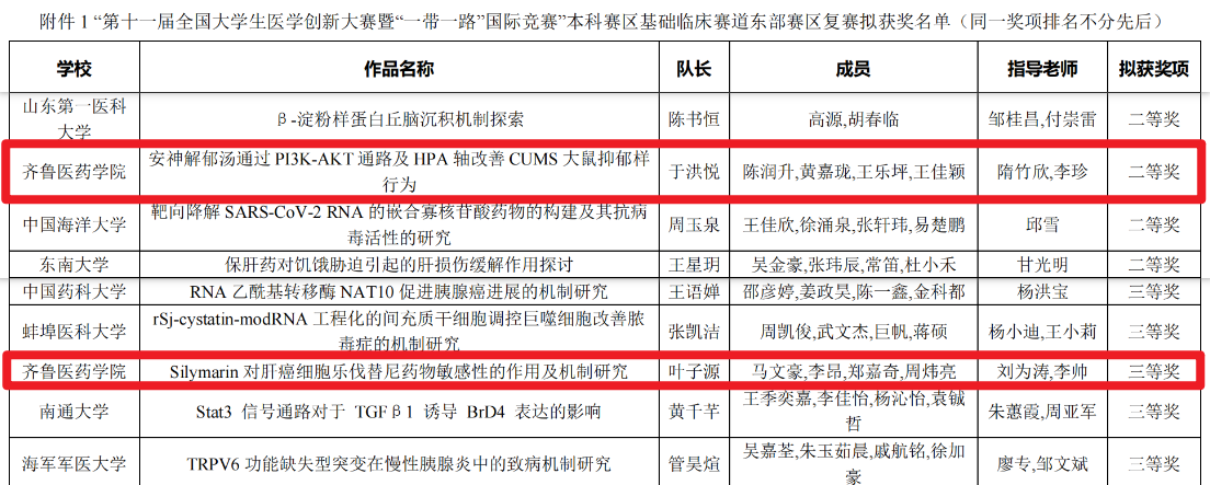 近日,由高等學校大學生醫學創新競賽委員會主辦的第十一屆全國大學生醫學創新大賽暨“一帶一路”國際競賽(以下簡稱“醫創賽”)基礎臨床賽道東部和北部賽區復賽在山西醫科大學順利落幕。齊魯醫藥學院項目《安神解郁湯通PI3K-AKT通路及HPA軸改善CUMS大鼠抑郁樣行為》《Silymarin對肝癌細胞樂伐替尼藥物敏感性的作用及機制研究》分獲二、三等獎。