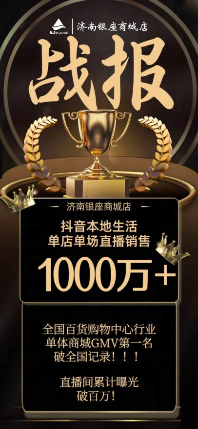 近日,銀座濟(jì)南商城店組織開展“27周年慶”抖音本地生活專場(chǎng)團(tuán)券大型直播活動(dòng),直播專場(chǎng)曝光量破百萬,銷售額超1000萬元,破抖音本地生活百貨購物中心行業(yè)單店單場(chǎng)直播GMV全國紀(jì)錄。