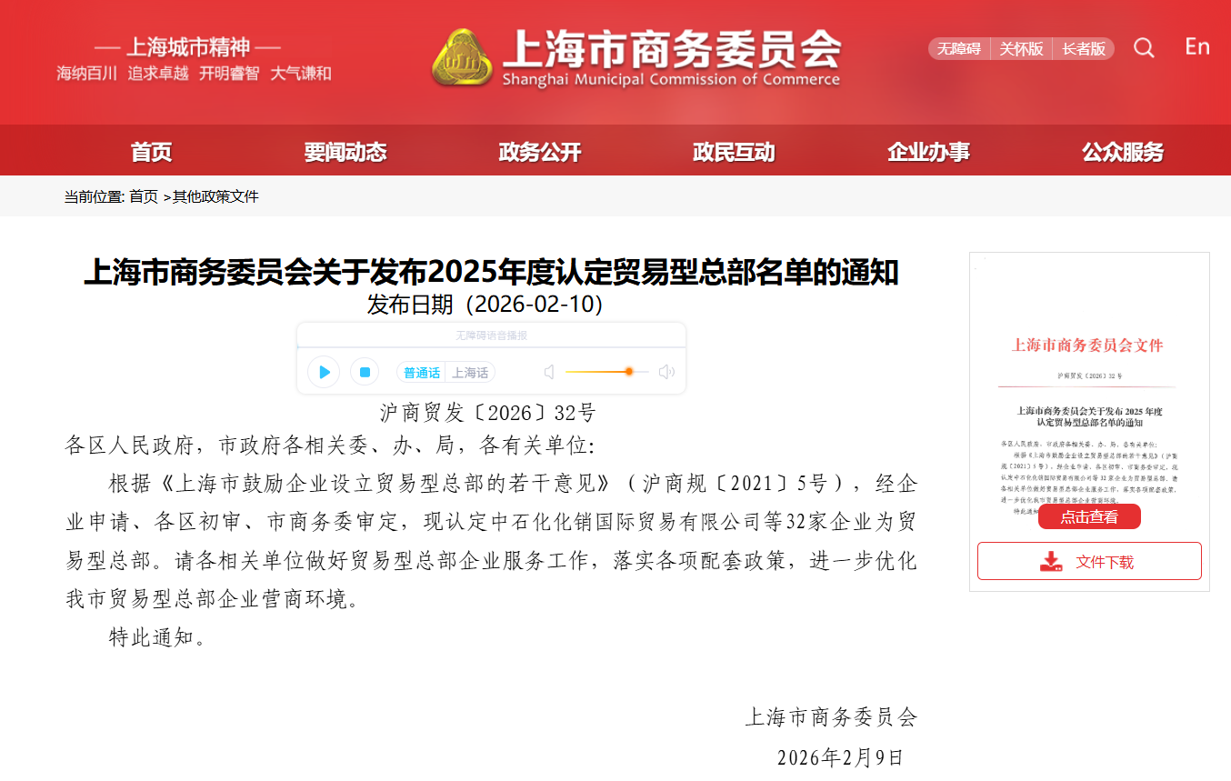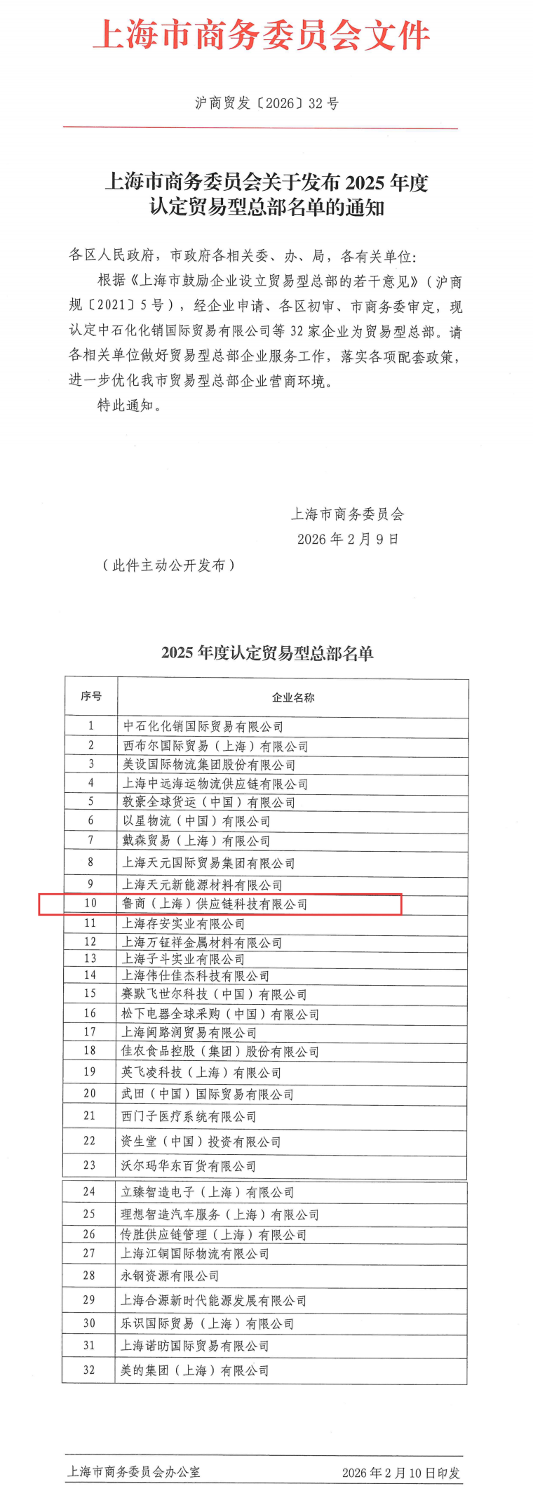 近日,上海市商務(wù)委員會正式公布了2025年度認(rèn)定的32家貿(mào)易型總部名單,魯商(上海)供應(yīng)鏈科技有限公司憑借穩(wěn)健的業(yè)務(wù)基礎(chǔ)、良好的行業(yè)積淀與成熟的綜合服務(wù)能力成功入選。